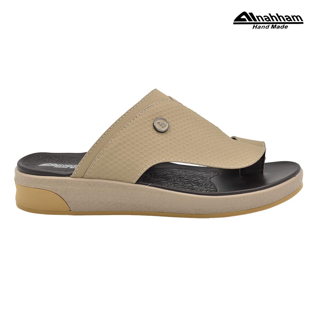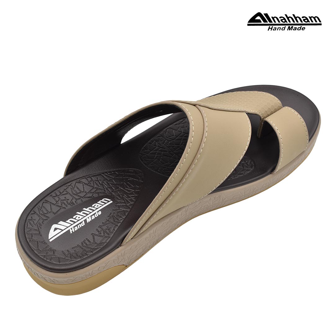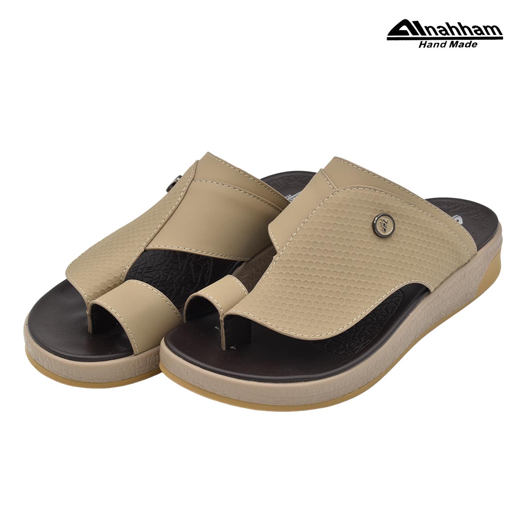 حافظ على راحة وسلامة قدميك من خلال صنادل الجلد المميزة من دار النحام. فهذا الصندل الغني بالنقوش مثالي لجميع المناسبات. صندل مصنوع من مواد عالية الجودة تتميز بخفة وزنها ومستوى أمانها العالي بفضل النعل ""المقاوم للانزلاق"". كما أن هذا الصندل الجلدي مصمم ليتحمل الاستعمال لفترة طويلة وتمت صناعته بواسطة متخصصين . فإذا كنت تريد أن تمشي بكل راحة وأناقة فلا تتردد في اقتناء هذا الصندل. هذا النعل مصنوع من الداخل من مواد عالية الجودة من البولي يوريثان الذي يتميز بالخفة والمتانة. تمت حياكته يدويًا باستخدام خيط مضفر قوي وتدوم الحياكة لفترة طويلة جدًا. تمنع بطانة النعل الداخلية المصنوعة من مواد عديمة الرائحة تراكم أي نوع من الروائح على سطحها مما يجعلها دائمًا نظيفة حتى بعد الاستخدام الطويل..